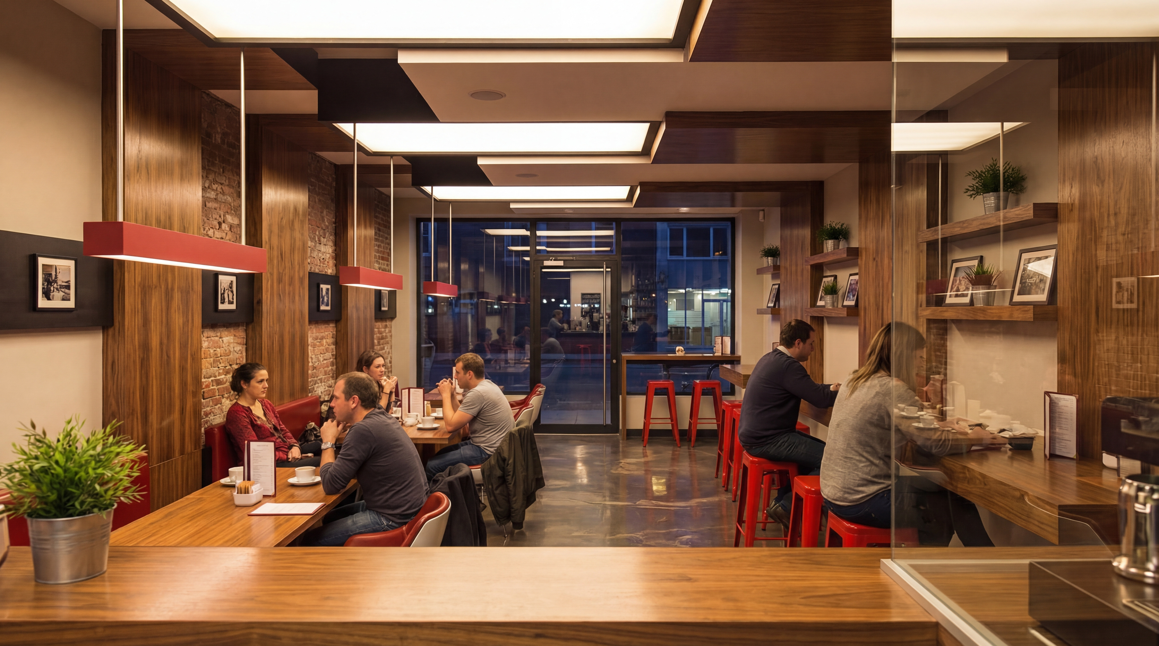 Café BRot is a small-scale yet characterful café design that offers a warm and intimate social atmosphere through its use of natural materials and compact spatial layout. The combination of exposed brick walls, walnut wood surfaces, and red accent elements creates an inviting and fluid interior suited for both everyday use and short breaks. The layered lighting scheme and the enveloping arrangement of the furniture provide a balanced, contemporary spatial experience centered around user comfort. Café BRot est un café de petite échelle mais doté d’une identité affirmée, offrant une atmosphère chaleureuse et intime grâce à l’usage de matériaux naturels et à son organisation spatiale compacte. L’association de murs en briques apparentes, de surfaces en bois de noyer et d’accents rouges crée un intérieur accueillant et fluide, adapté aussi bien à un usage quotidien qu’à de courtes pauses. Le dispositif d’éclairage en strates et la composition enveloppante du mobilier offrent une expérience spatiale contemporaine et équilibrée, centrée sur le confort de l’utilisateur.