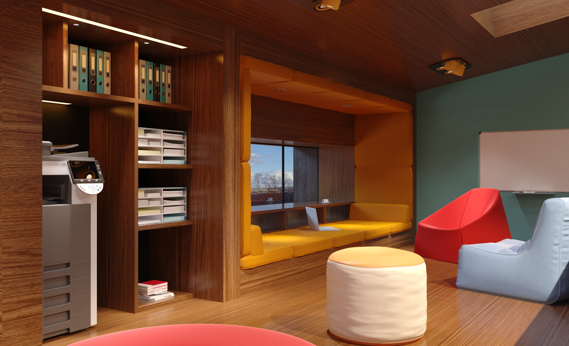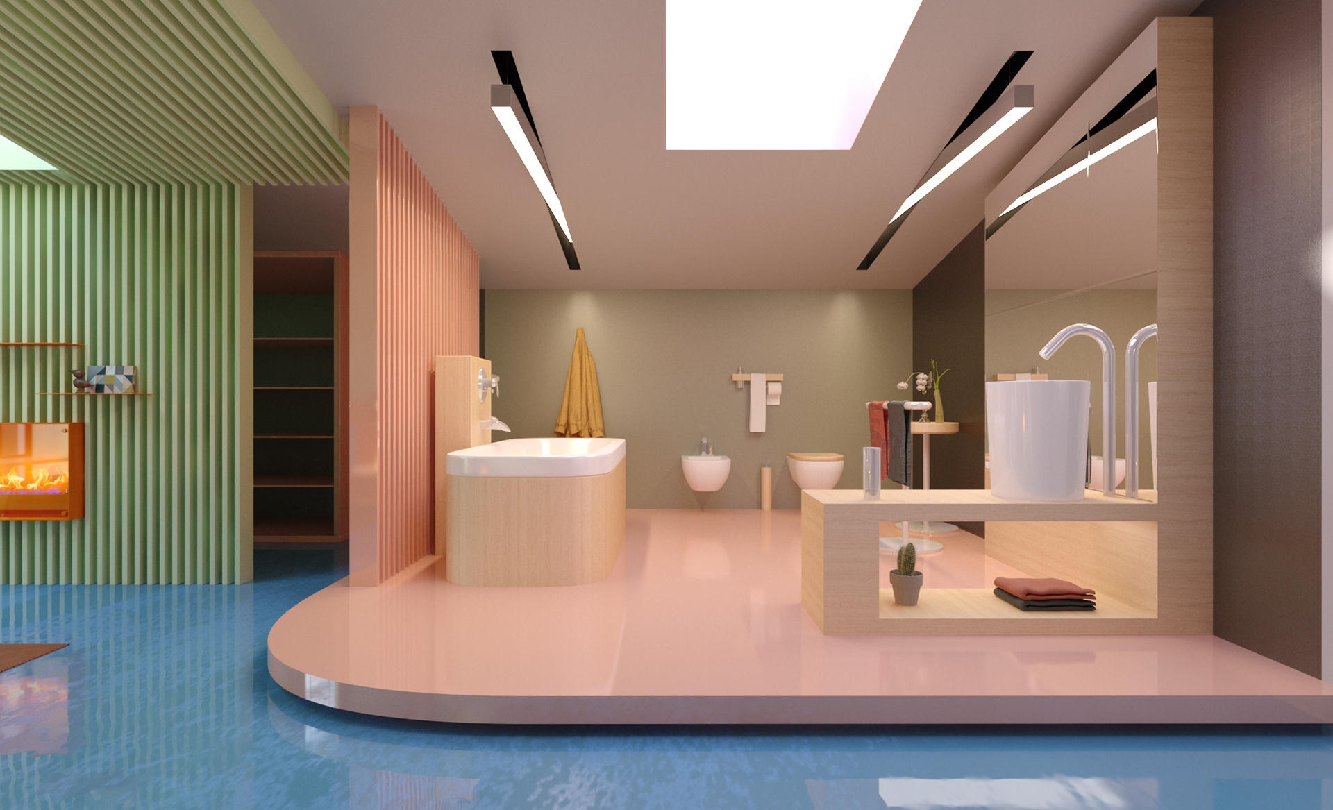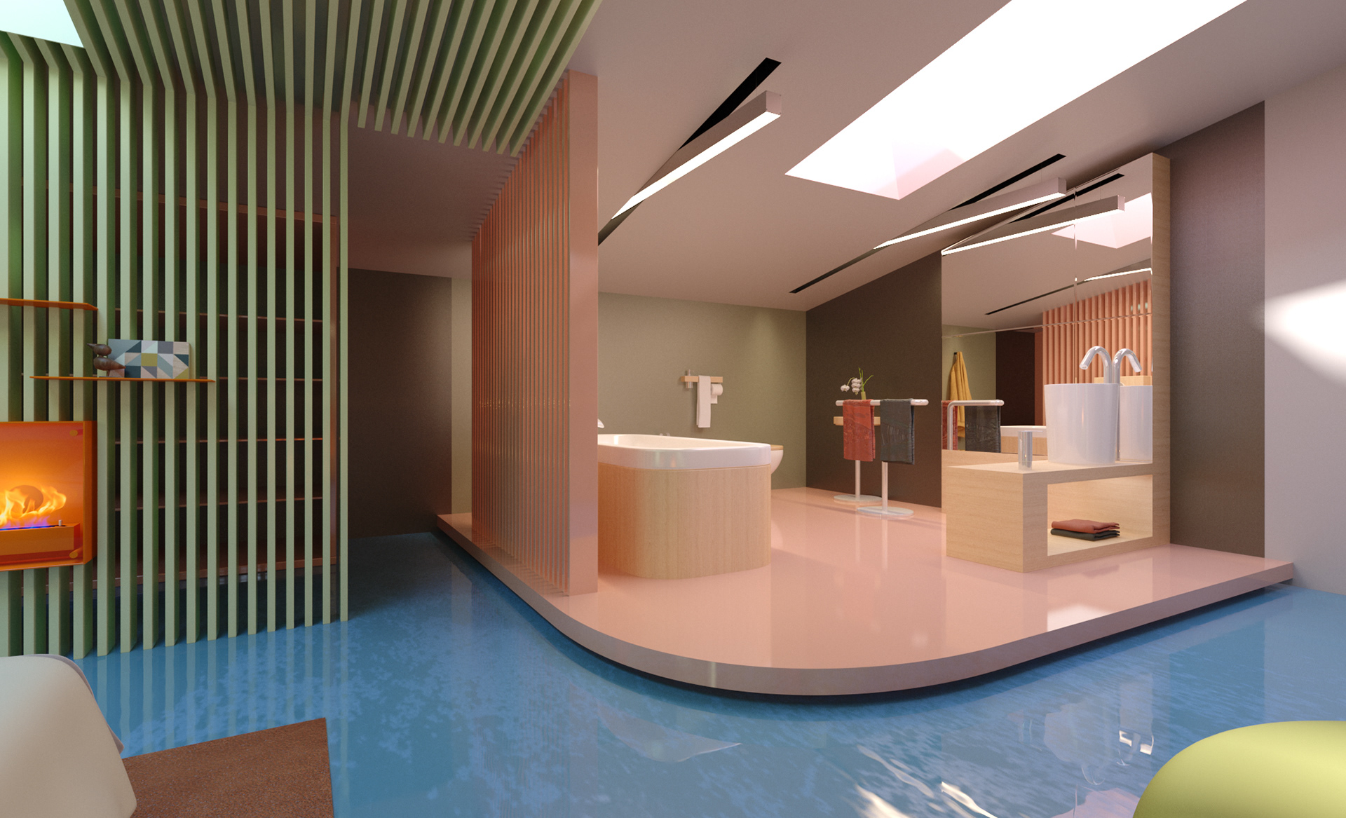 Combining showroom and office functions within a fictional “live–work” scenario, this interior establishes a dynamic atmosphere shaped by wide openings, warm wooden surfaces, and expressive color blocks. The design enhances the workspace with large windows oriented toward the natural landscape, while more intimate areas are defined through soft textures and brightly toned furnishings. Sculptural forms and pastel finishes in the wellness spaces introduce a contemporary yet serene character. This holistic approach merges the efficiency of a professional environment with the comfort of a home, creating an inspiring setting for both living and working. Réunissant les fonctions de showroom et de bureau dans un scénario fictif « vivre–travailler », cet aménagement intérieur développe une atmosphère dynamique articulée autour de larges ouvertures, de surfaces en bois chaleureux et de jeux de couleurs affirmés. Le design valorise les espaces de travail grâce à de grandes baies orientées vers le paysage, tandis que les zones plus intimistes se distinguent par des textures douces et un mobilier aux teintes vives. Les formes sculpturales et les finitions pastel des espaces bien-être confèrent au lieu une identité contemporaine et apaisante. Cette approche globale associe l’efficacité d’un environnement professionnel au confort d’un intérieur domestique, offrant un cadre inspirant pour vivre et travailler.