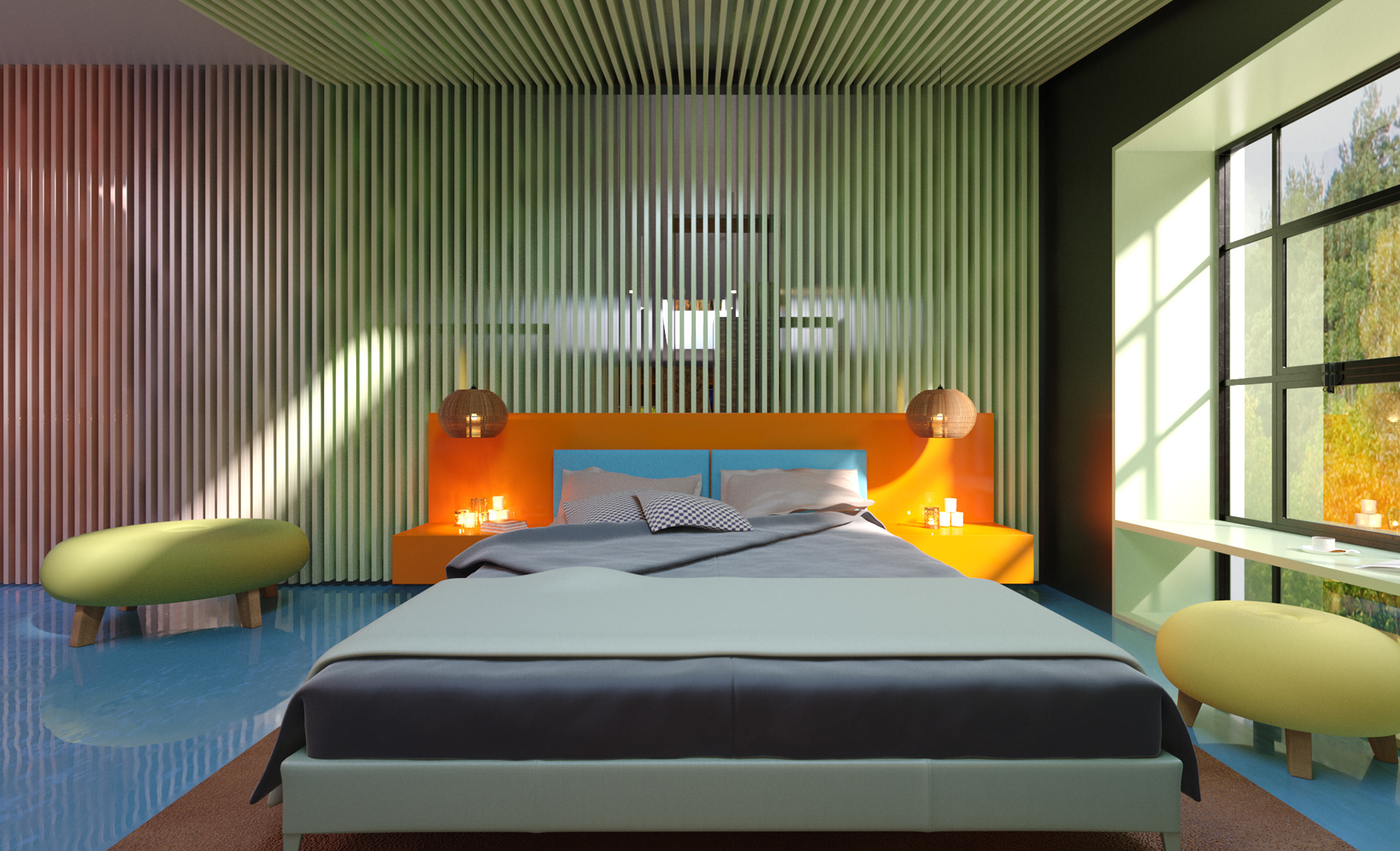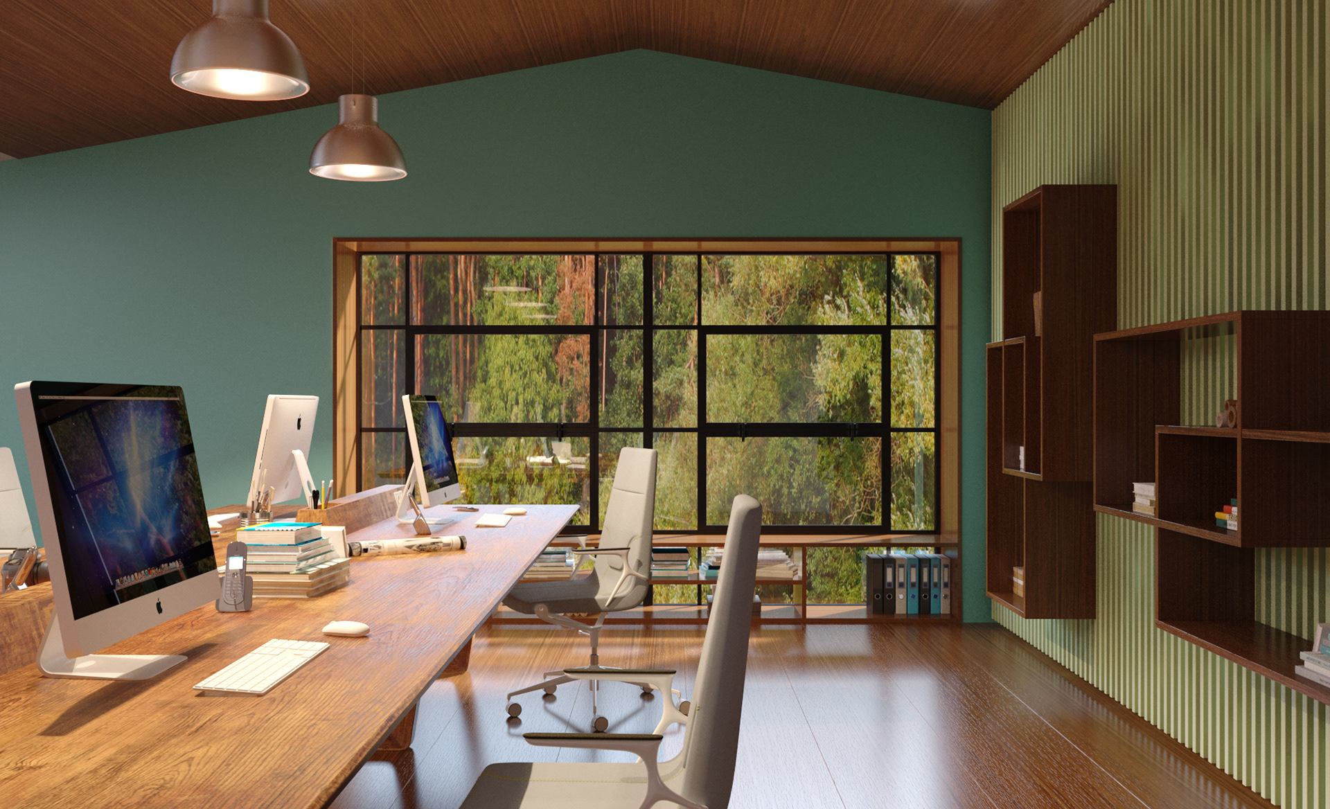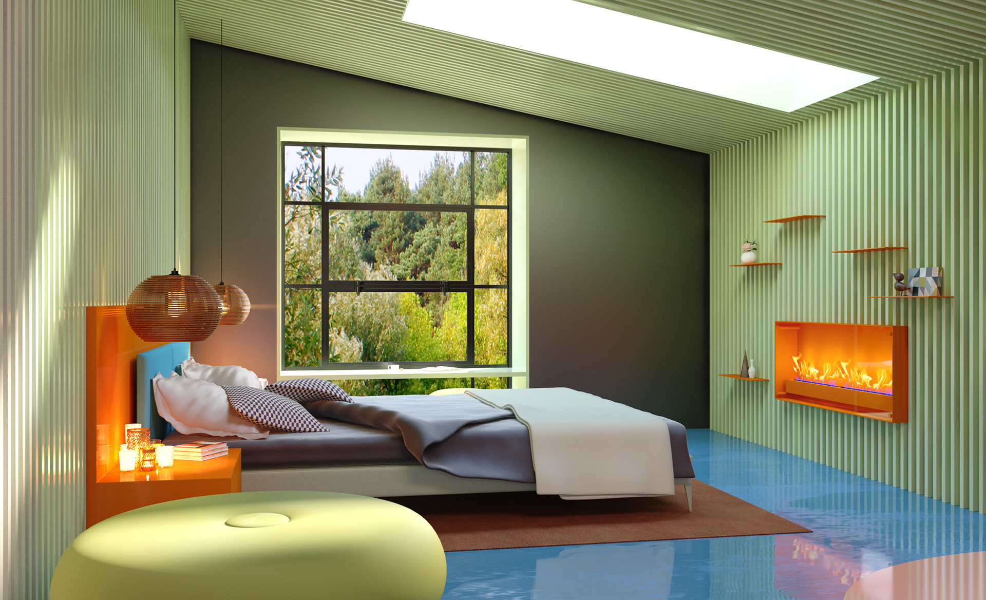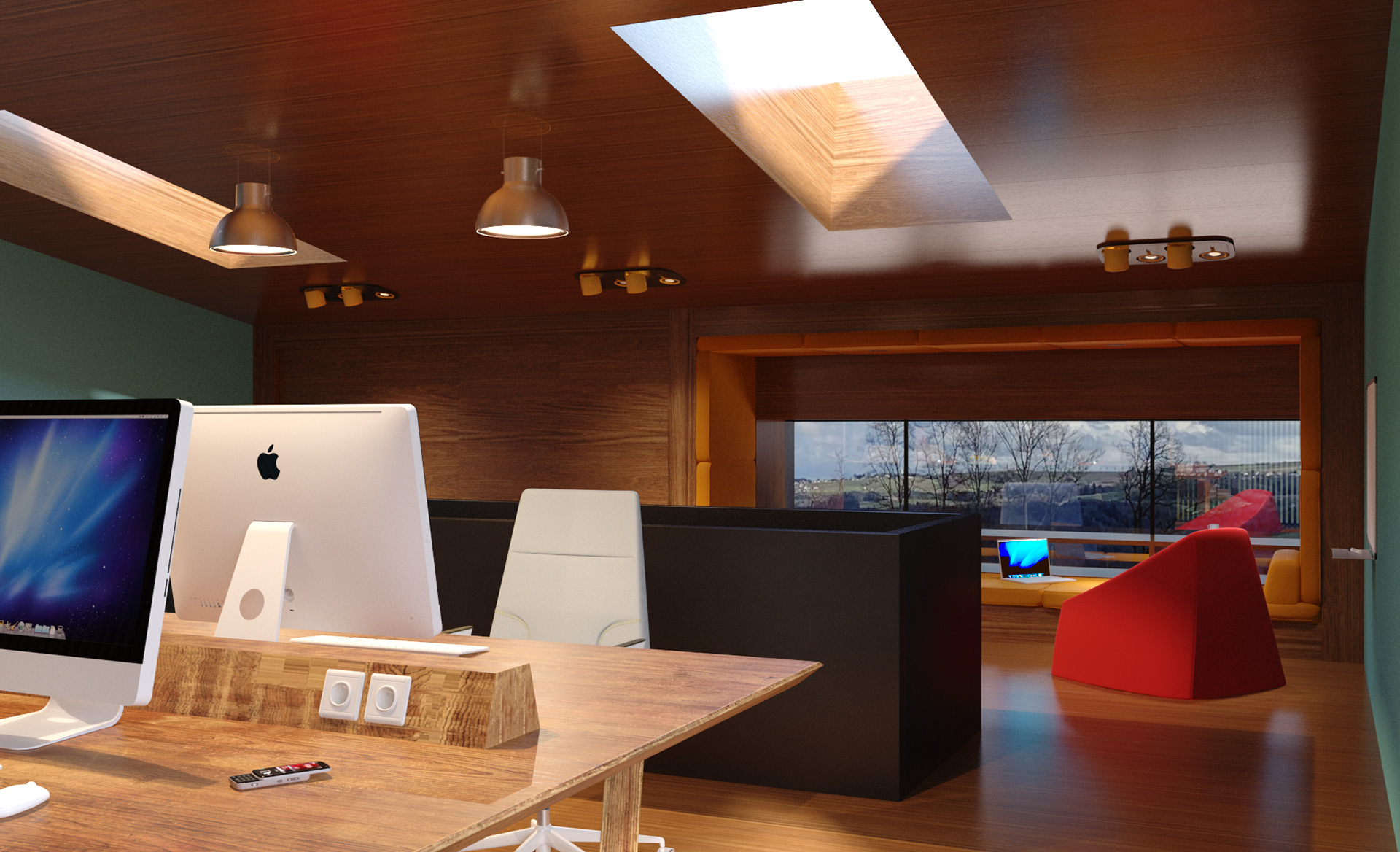 Combining showroom and office functions within a fictional “live–work” scenario, this interior establishes a dynamic atmosphere shaped by wide openings, warm wooden surfaces, and expressive color blocks. The design enhances the workspace with large windows oriented toward the natural landscape, while more intimate areas are defined through soft textures and brightly toned furnishings. Sculptural forms and pastel finishes in the wellness spaces introduce a contemporary yet serene character. This holistic approach merges the efficiency of a professional environment with the comfort of a home, creating an inspiring setting for both living and working. Réunissant les fonctions de showroom et de bureau dans un scénario fictif « vivre–travailler », cet aménagement intérieur développe une atmosphère dynamique articulée autour de larges ouvertures, de surfaces en bois chaleureux et de jeux de couleurs affirmés. Le design valorise les espaces de travail grâce à de grandes baies orientées vers le paysage, tandis que les zones plus intimistes se distinguent par des textures douces et un mobilier aux teintes vives. Les formes sculpturales et les finitions pastel des espaces bien-être confèrent au lieu une identité contemporaine et apaisante. Cette approche globale associe l’efficacité d’un environnement professionnel au confort d’un intérieur domestique, offrant un cadre inspirant pour vivre et travailler.