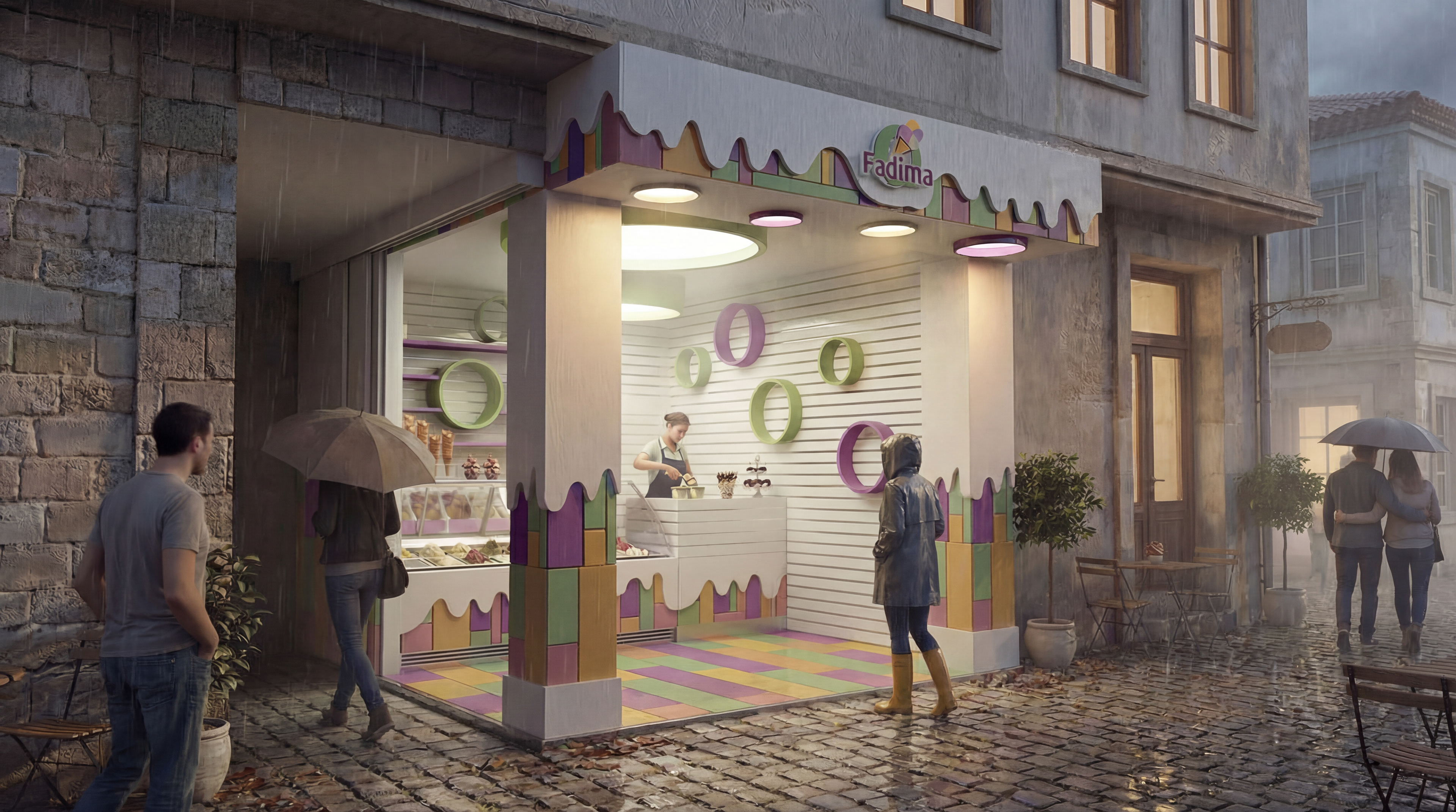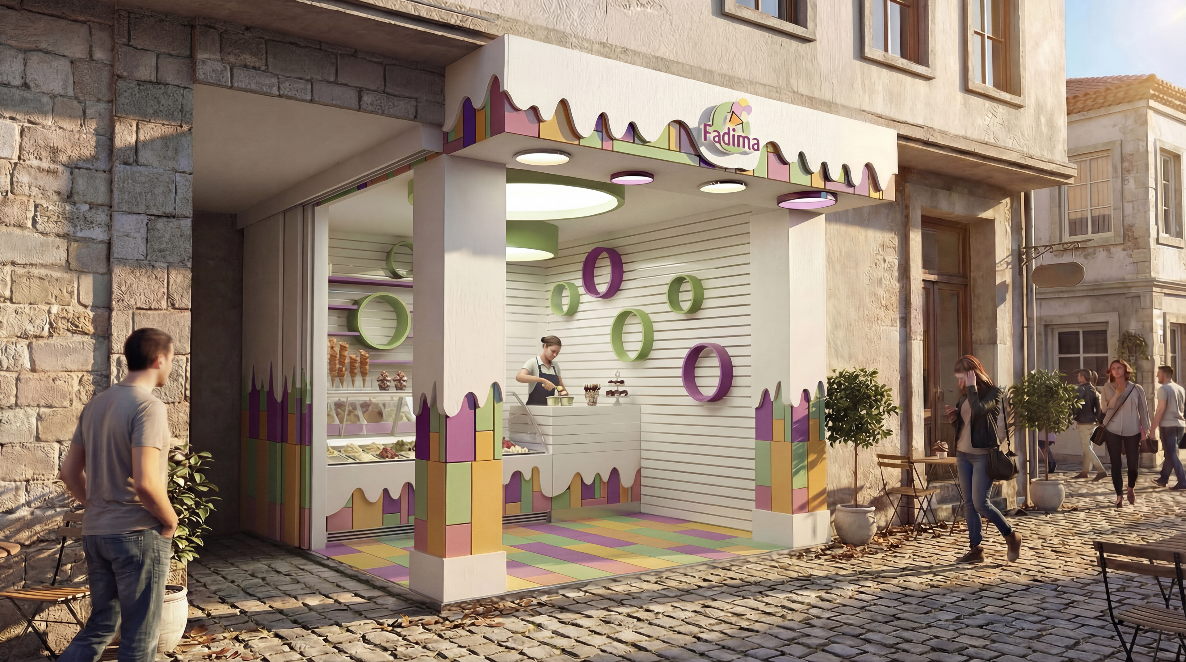 Fadima Ice Cream Shop presents a design approach in which color and geometry take center stage, creating a strong identity despite its small scale within a narrow urban street texture. The space establishes a lively rhythm through pastel-toned graphic panels and circular wall elements, while its open layout maintains a seamless interior–exterior continuity and a natural relationship with the street. Light effects and material choices carry the shop’s emphasis on freshness and craftsmanship into the space, resulting in an atmosphere that is both contemporary and inviting. La boutique de glaces Fadima adopte une approche de conception où la couleur et la géométrie occupent une place centrale, affirmant une identité forte malgré sa petite échelle au sein d’un tissu urbain étroit. L’espace crée un rythme vivant grâce à des panneaux graphiques aux tons pastels et à des éléments muraux circulaires, tandis que son plan ouvert maintient une continuité intérieur–extérieur fluide et une relation naturelle avec la rue. Les jeux de lumière et les choix de matériaux transmettent l’accent mis par la boutique sur la fraîcheur et le savoir-faire, donnant naissance à une atmosphère à la fois contemporaine et chaleureuse.