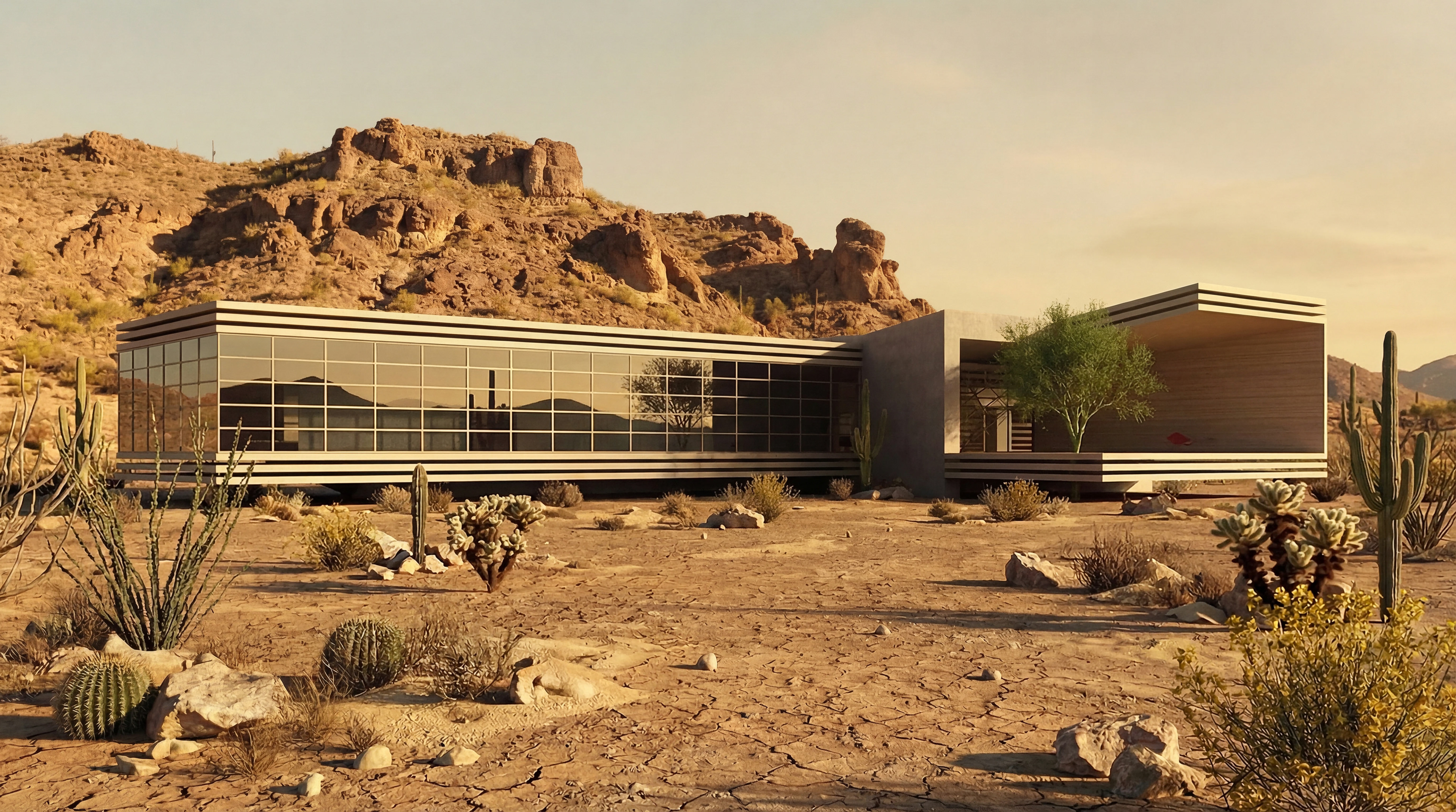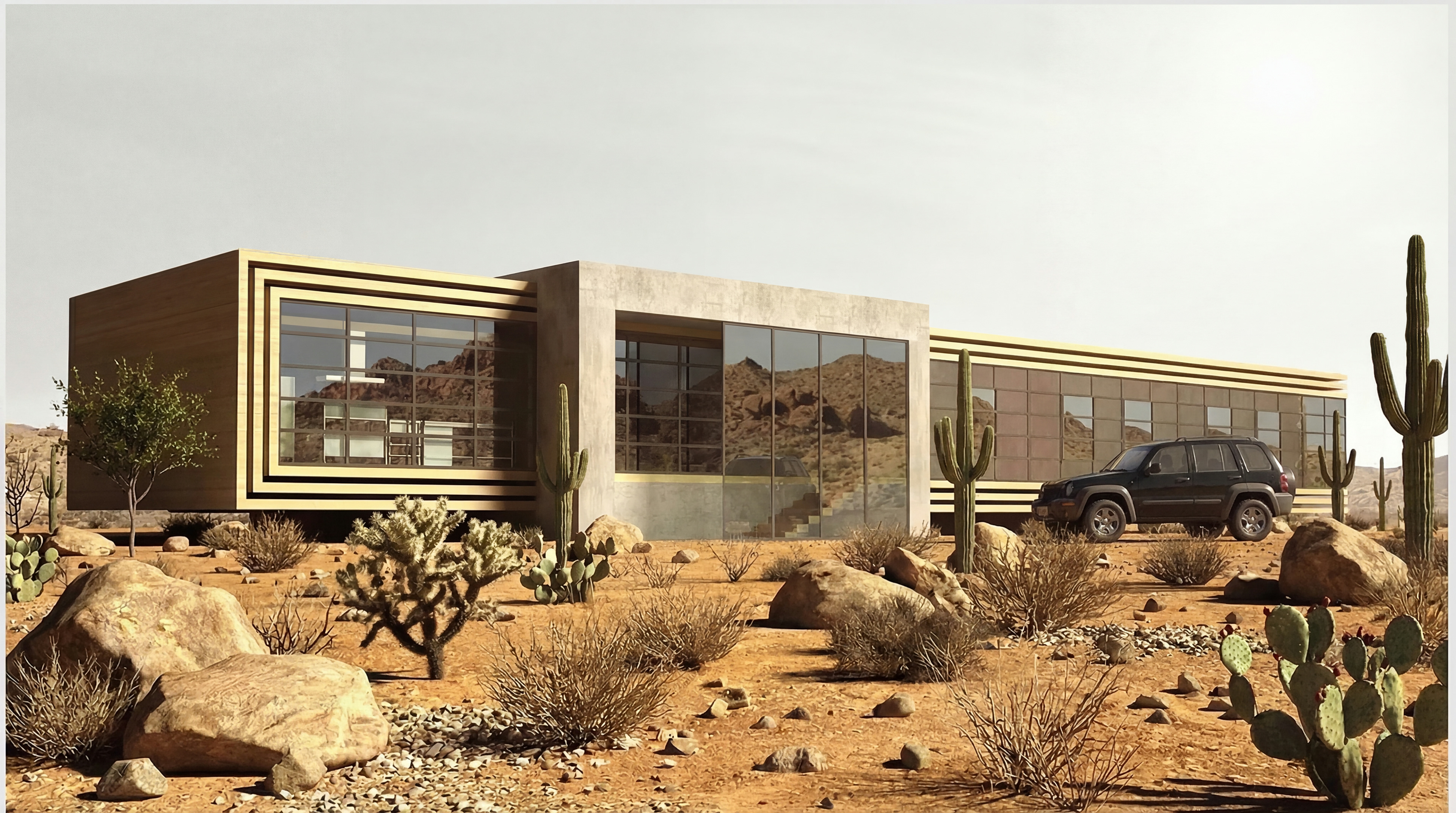 Located within the arid landscapes of the Arizona desert, Linear House is designed as a self-sufficient residence powered entirely by solar energy. The elevated structure minimizes dust infiltration while giving the house a light and unobtrusive relationship with its surroundings. With no partitions separating the terrace from the exterior, the design creates an uninterrupted sense of continuity toward the horizon. Exposed plain concrete-used as the main structural material-helps maintain interior coolness under desert heat. These concrete surfaces form a linear spine that begins at the entrance, flows through the living area, and extends outward to the terrace. This central zone is intentionally left open and unbounded, allowing the interior to merge seamlessly with the outdoors. Clad in wood on the exterior, the elongated main wing provides individual access to each room along a transverse corridor. Beyond the two bedrooms lies a fully glazed space dedicated to reading and relaxation, offering an immersive connection to the surrounding desert landscape. Linear House presents a quiet yet striking interpretation of modern and sustainable living in the Arizona desert, articulated through its pure geometry, climate-responsive materiality, and architectural integration with the desert topography. Implantée au cœur des paysages arides du désert de l’Arizona, Linear House est conçue comme une habitation autonome fonctionnant entièrement à l’énergie solaire. Sa structure surélevée limite l’infiltration de poussière tout en établissant une relation légère et discrète avec son environnement. L’absence de séparation entre la terrasse et l’extérieur crée une continuité ininterrompue vers la ligne d’horizon. Le béton brut apparent, utilisé comme matériau structurel principal, contribue à maintenir la fraîcheur intérieure sous la chaleur du désert. Ces surfaces en béton forment une colonne vertébrale linéaire qui commence à l’entrée, traverse l’espace de vie et se prolonge jusqu’à la terrasse. Cette zone centrale, volontairement ouverte et non cloisonnée, permet une transition fluide entre intérieur et extérieur. Revêtue de bois à l’extérieur, l’aile principale allongée offre un accès individuel à chaque pièce le long d’un couloir transversal. Au-delà des deux chambres se trouve un espace entièrement vitré dédié à la lecture et à la détente, offrant une connexion immersive avec le paysage désertique. Linear House propose une interprétation à la fois discrète et saisissante d’un mode de vie moderne et durable dans le désert de l’Arizona, portée par une géométrie épurée, une matérialité adaptée au climat et une intégration harmonieuse dans la topographie environnante.