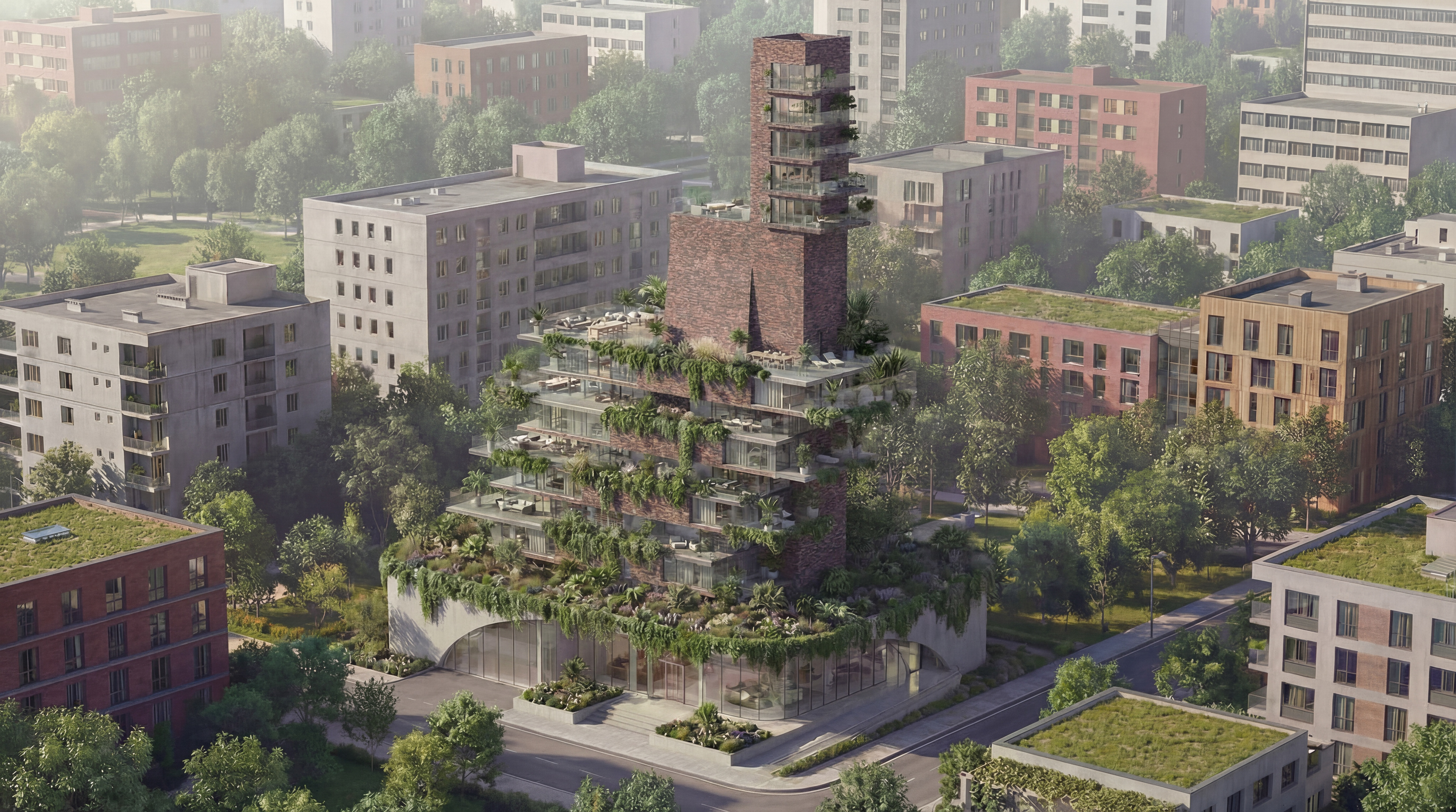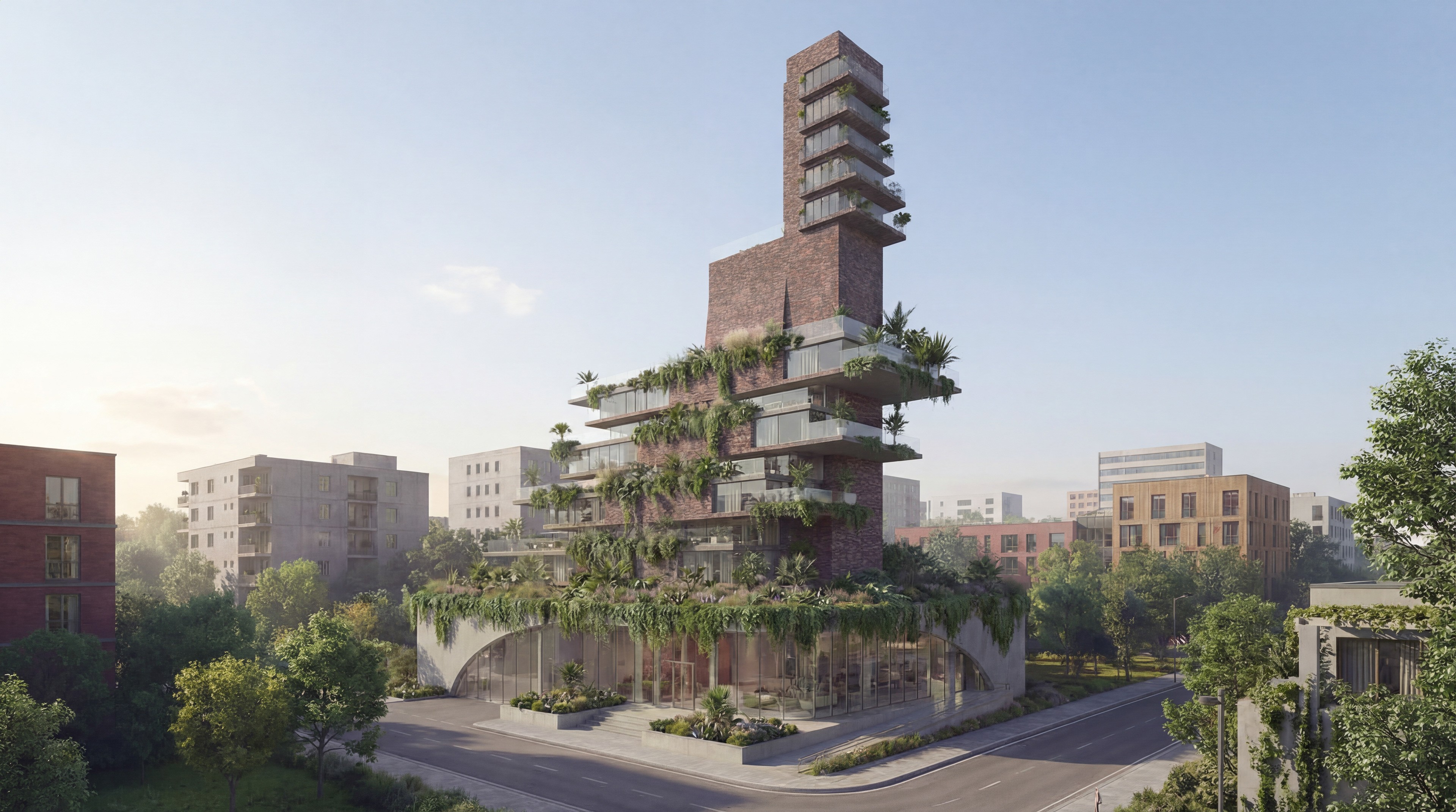 loft UP is a conceptual residential project built upon the striking interplay of brick block, concrete, metal, and glass, offering a contemporary interpretation of loft living culture. Its vertically rising sculptural mass, expansive terraces extending across different levels, and lush planting strategy define the building’s overall character through a powerful vertical-garden effect. The continuous presence of greenery on every floor integrates the living spaces with natural landscape, giving the project a breathing, tranquil, and biophilic atmosphere. loft UP represents an innovative residential experience that brings together structural expression and contemporary comfort, combining an industrial material language-where raw materials are presented honestly-with a design that opens seamlessly toward nature. loft UP est un projet résidentiel conceptuel fondé sur l’interaction saisissante entre le bloc de briket, le béton, le métal et le verre, offrant une interprétation contemporaine de la culture loft. Sa masse sculpturale s’élevant verticalement, ses terrasses généreuses réparties sur différents niveaux et sa stratégie de végétalisation abondante définissent le caractère général du bâtiment à travers un puissant effet de jardin vertical. La présence continue de verdure à chaque étage intègre les espaces de vie au paysage naturel, conférant au projet une atmosphère respirante, sereine et biophilique. loft UP représente une expérience résidentielle innovante qui réunit expression structurelle et confort contemporain, associant un langage matériel industriel, où les matériaux bruts sont présentés avec honnêteté-à une conception qui s’ouvre harmonieusement sur la nature.