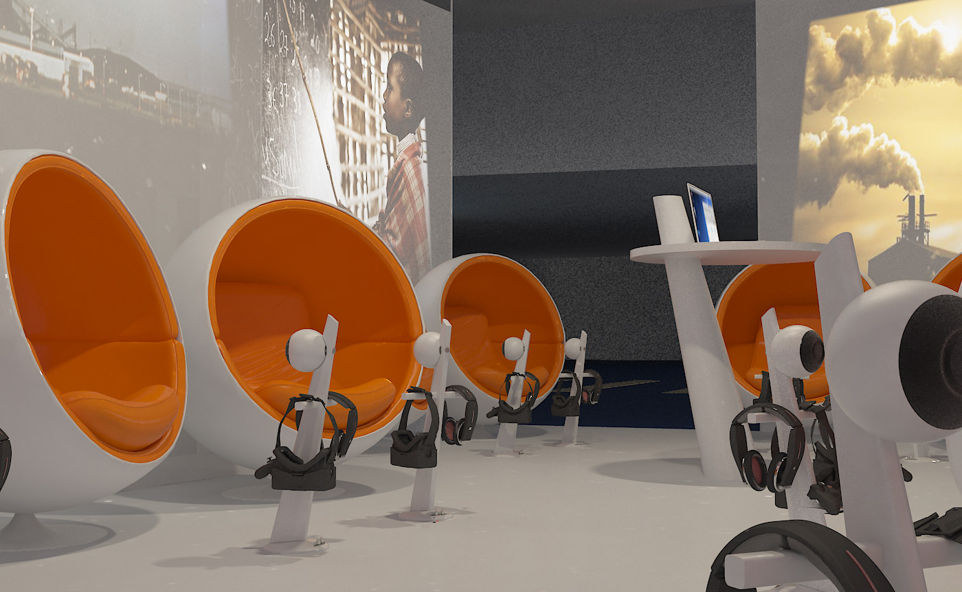 For each participant, is designed an entertainment stand that contains all the elements for a virtual reality system: Oculus Rift, headphone, webcam and joystick. For visual and ergonomic reasons all the cables are hidden under the floor. A 360-degrees swivel table is made for the speaker where he can organize event and control electronic system with a computer while keeping eye contact with every participant. Pour chaque participant est conçu un stand de divertissement qui contient tous les éléments d'un système de réalité virtuelle : Oculus Rift, casque, webcam et manette de jeu. Pour des raisons visuelles et ergonomiques tous les câbles sont cachés sous le plancher. Une table pivotante à 360 degrés est faite pour le conférencier qui peut organiser des événements et avoir en même temps le contrôle du système électronique avec un ordinateur tout en gardant le contact visuel avec chaque participant.