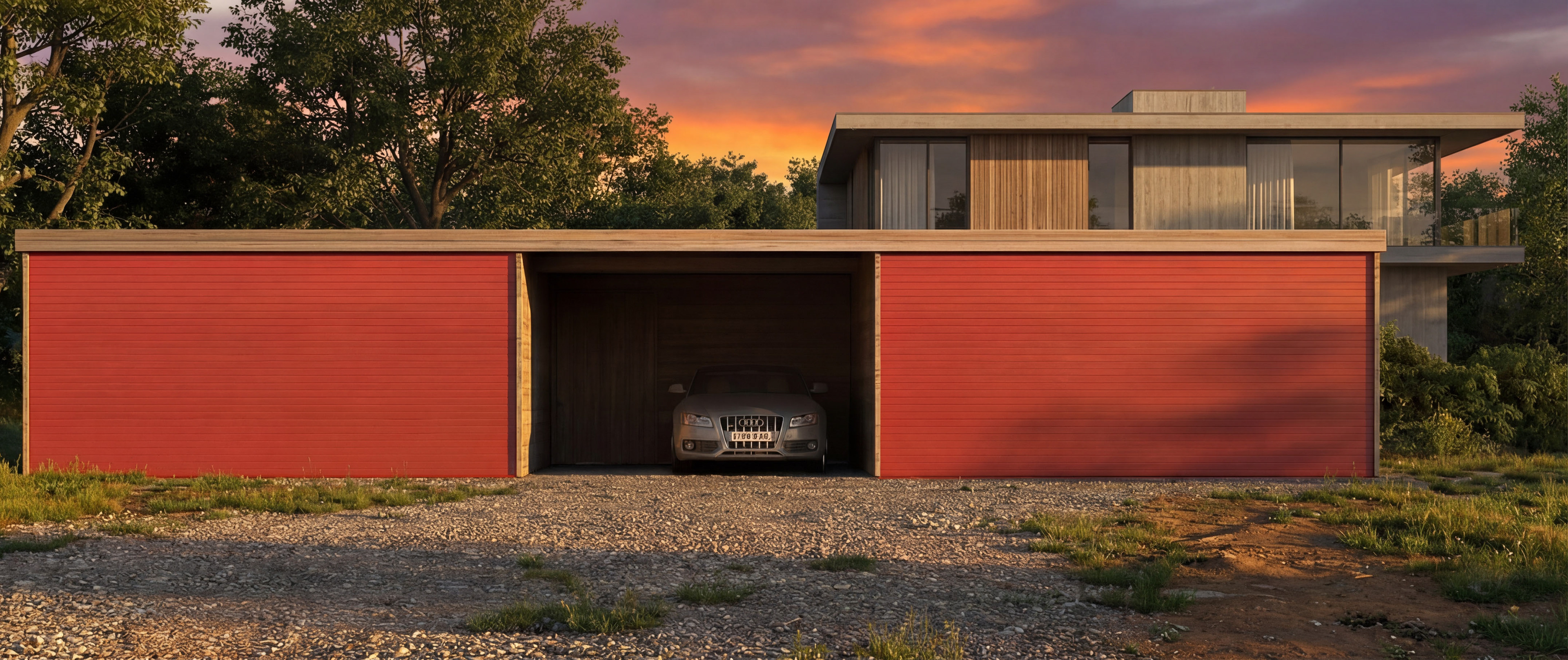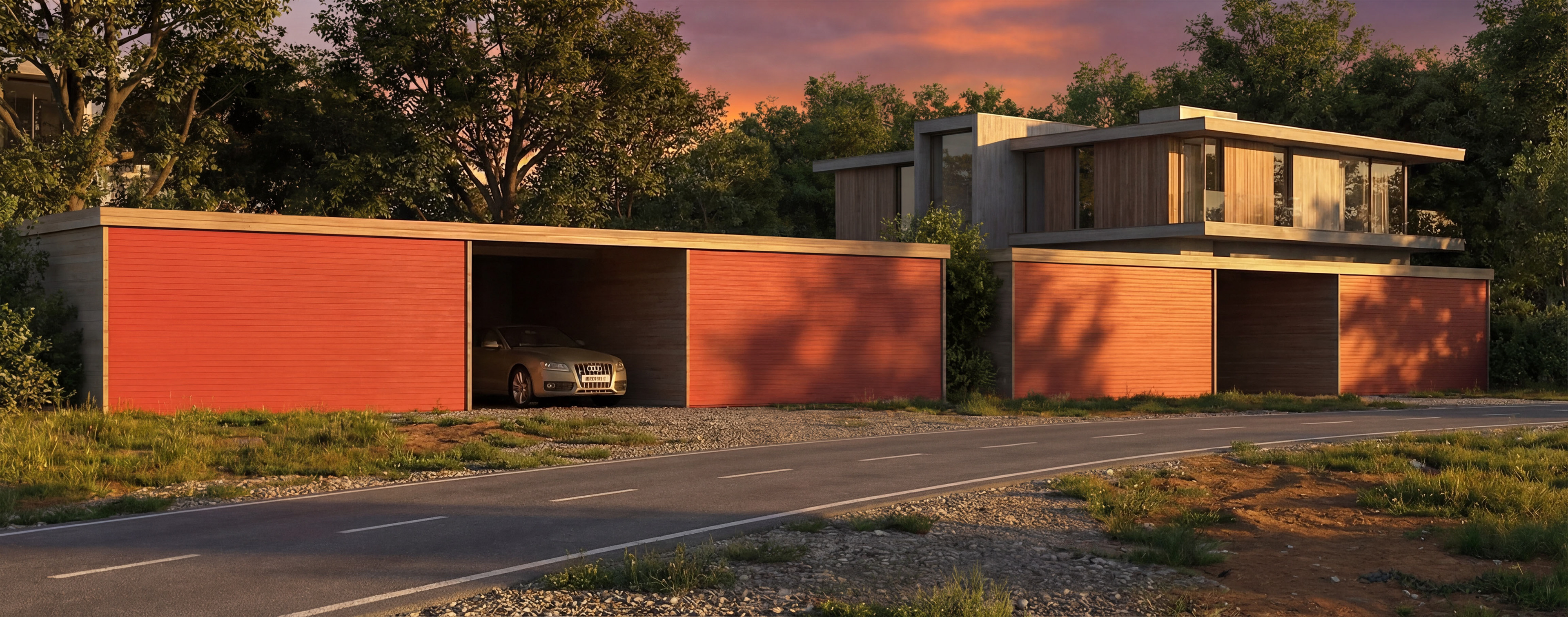 This carport design, defined by its simple geometry and natural material palette, aims to create a sheltered and refined space for vehicle storage. The timber cladding and horizontal lines allow the structure to blend harmoniously with its surroundings, while the wide openings ensure easy maneuverability and practical daily use. The result is a modern outdoor solution that combines functionality with a clean architectural expression. Ce carport, caractérisé par une géométrie simple et une sélection de matériaux naturels, vise à offrir un espace abrité et épuré pour le stationnement des véhicules. Le revêtement en bois et les lignes horizontales permettent à la structure de s’intégrer harmonieusement dans son environnement, tandis que les larges ouvertures assurent une utilisation pratique et une manœuvrabilité aisée. L’ensemble constitue une solution extérieure moderne qui allie fonctionnalité et expression architecturale sobre.